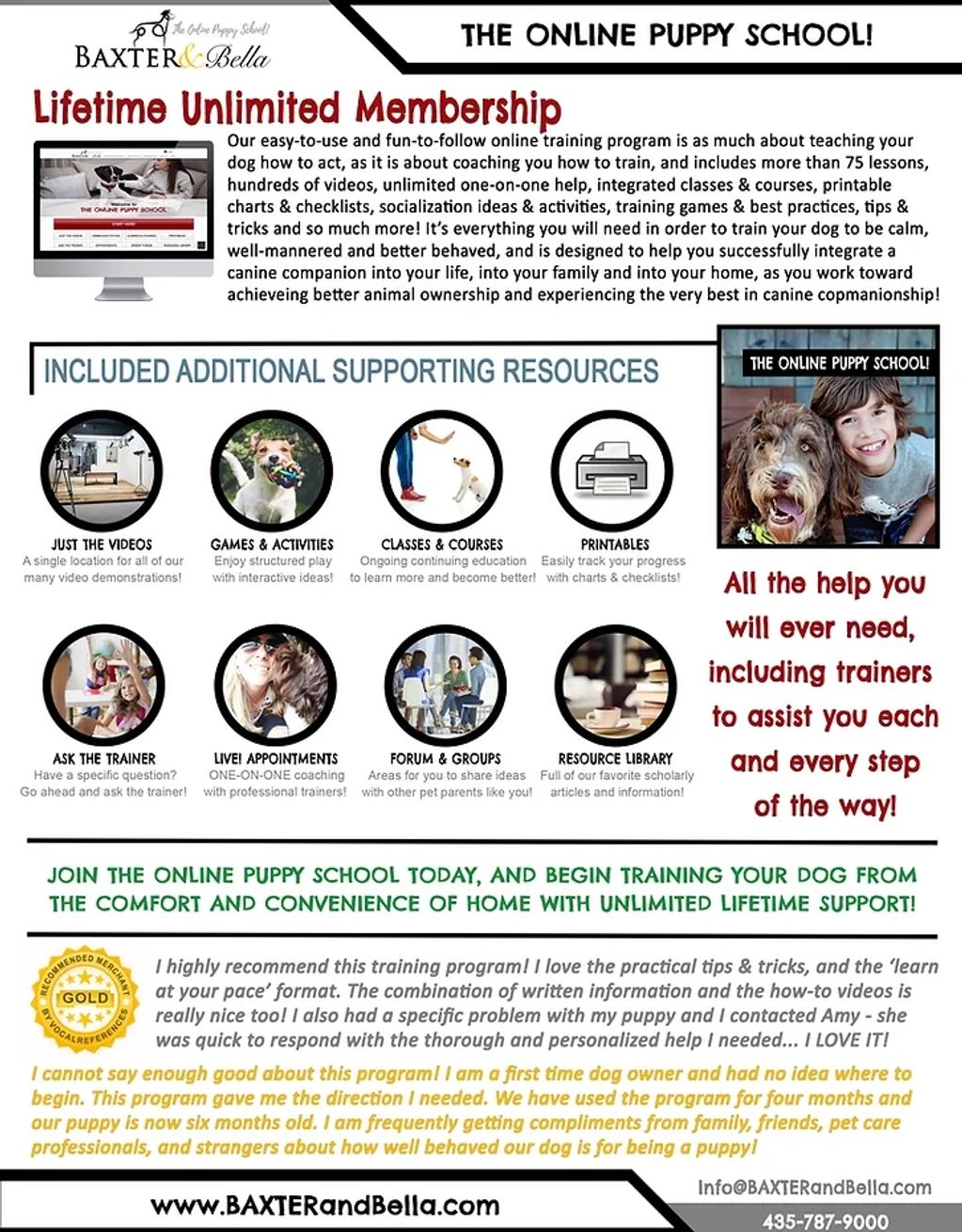 In fact, their online puppy school program has all the training resources you will need to successfully integrate your dog into your life, family and home, in addition to their personal promise of helping you each and every step of the way toward achieving better animal ownership and experiencing the very best in canine companionship!